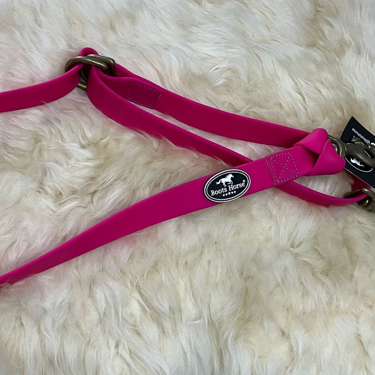 Palavras-chave: Cabo de Gamarra Silicone Boots Horse, cabo de gamarra rosa, mosquetão de latão, fita de silicone resistente, controle para cavalos, acessório equestre premium, treino e competição.