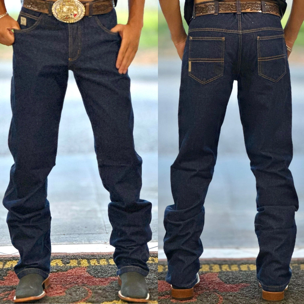 | Material | Jeans 100% Algodão (Garante maior durabilidade e rigidez, comum em calças para rodeio ou trabalho no campo). |
