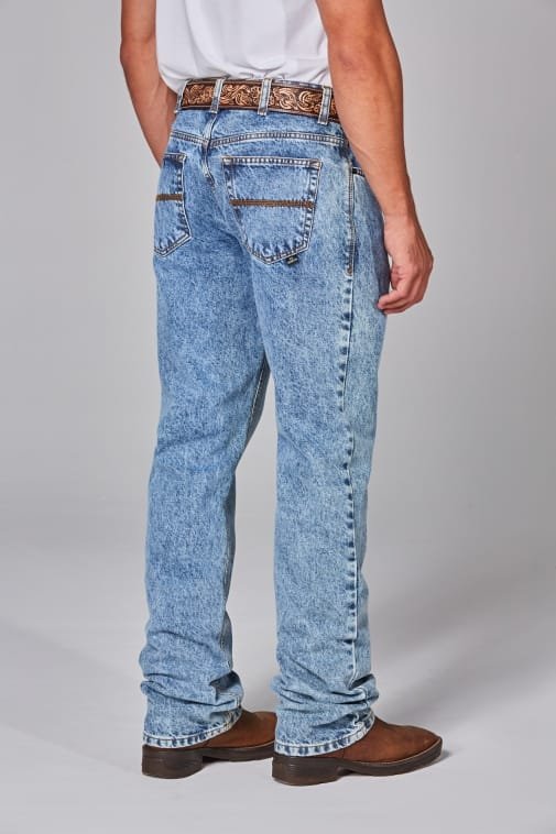 DetalhesApresenta costura reforçada (muitas vezes dupla), 7 passantes de cinto e o clássico design de 5 bolsos (incluindo o bolso canivete), comum nos modelos country.