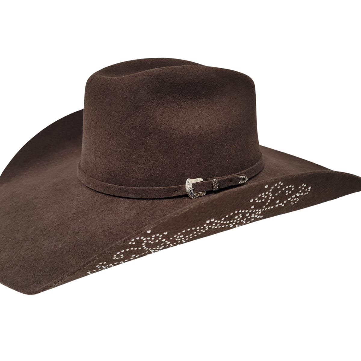 A verdadeira joia deste chapéu é a combinação de detalhes que o tornam único: a fita em feltro com fivela, passador e ponteira de metal adiciona um toque de sofisticação, enquanto a aplicação de strass na parte inferior da aba confere um brilho especial e um toque de modernidade.
